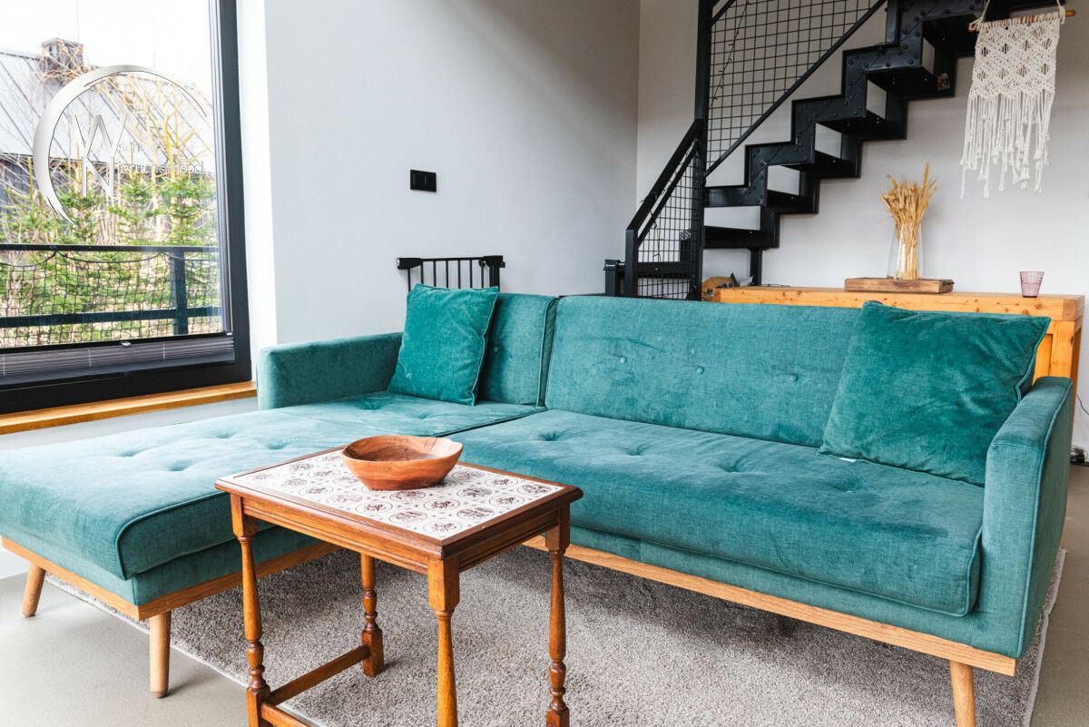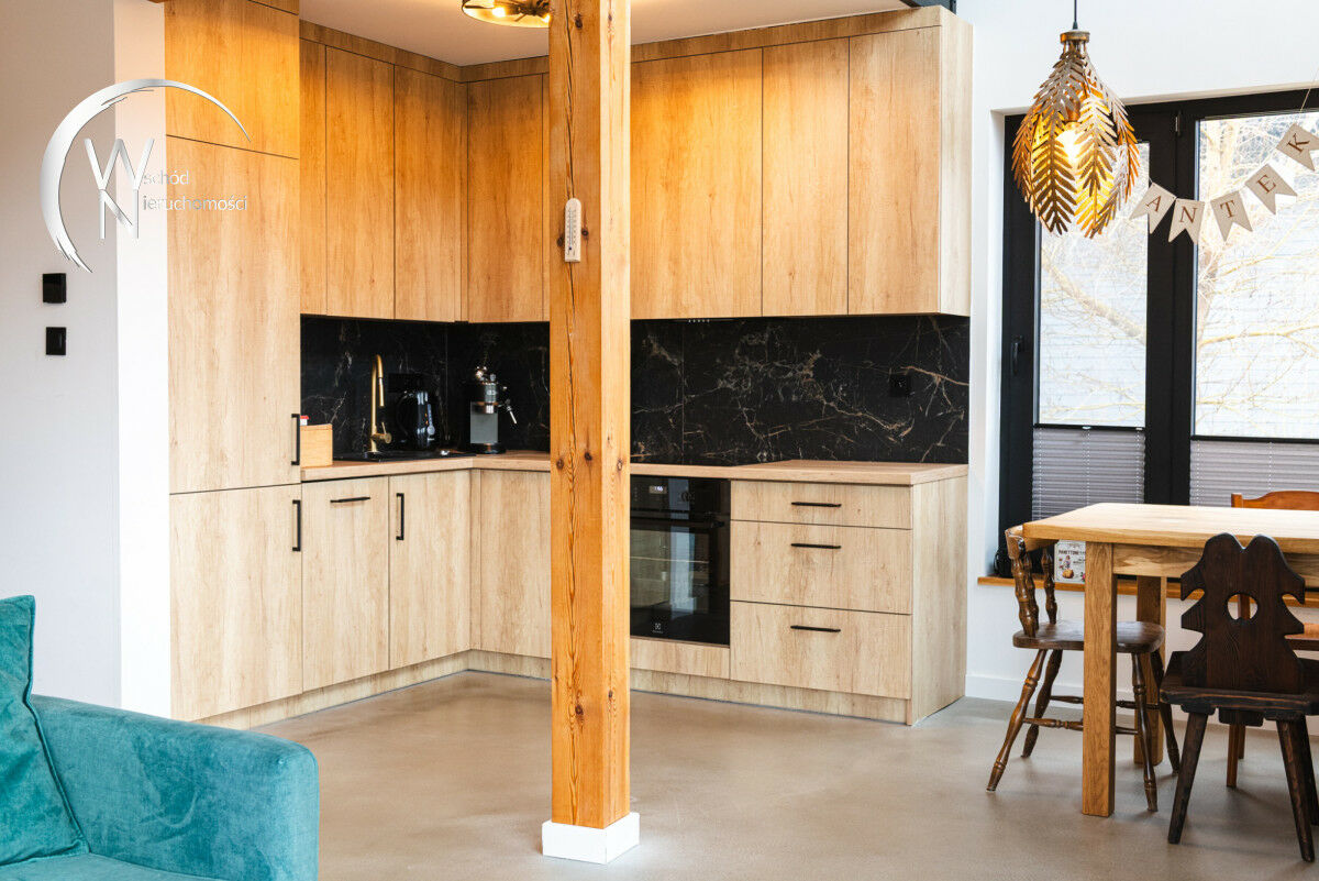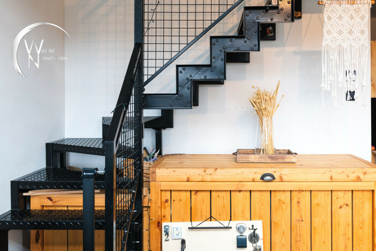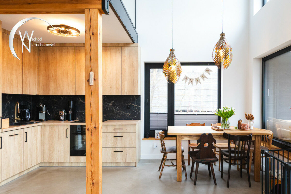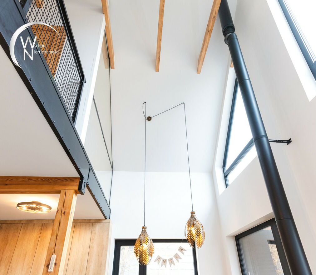 ✔ wnętrze: loftowy charakter z elementami drewna i metalu.