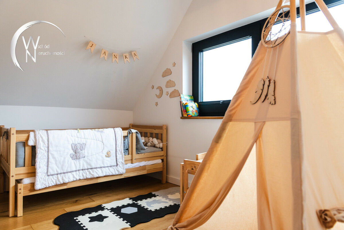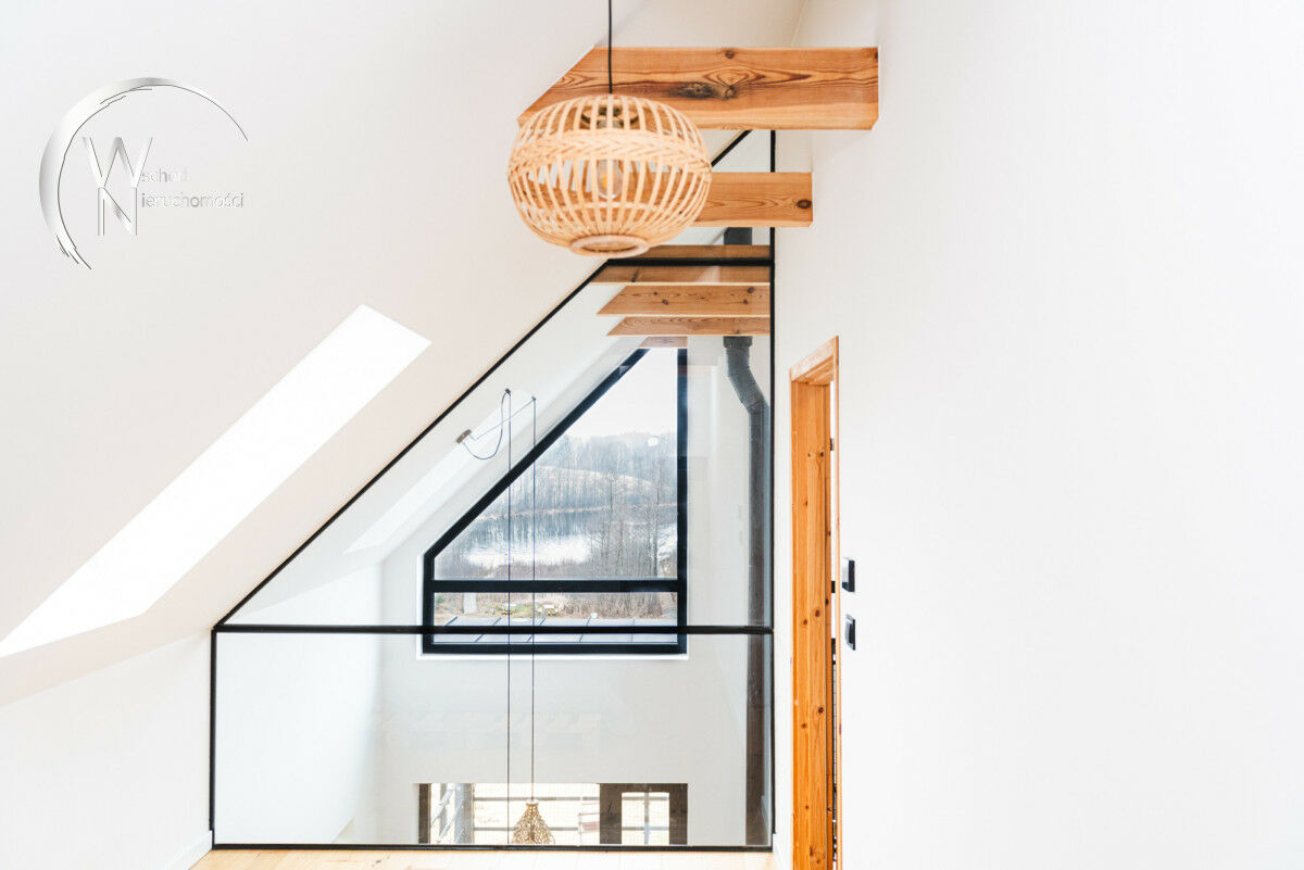 ✔ poddasze użytkowe: 2 pokoje (jeden z nich posiada szklaną ścianę, co zapewnia widok na jezioro), otwarta antresola z miejscem do wypoczynku,